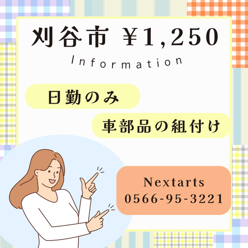 仕事内容 | / 自動車の内装部品を 加工している会社です☆ \ 1、自動車部品を機械にセット 2、ボタンをぽちっ 3、出てきたものをチェックして箱にいれる 基本的に1→3の繰り返しです! 近くに先輩スタッフがいるので 未経験の方も、安心して働けます(*‘∀‘) 職場見学だけでもOKです♪ 少しでもキニナル方は、まずはご応募お待ちしてます。 |